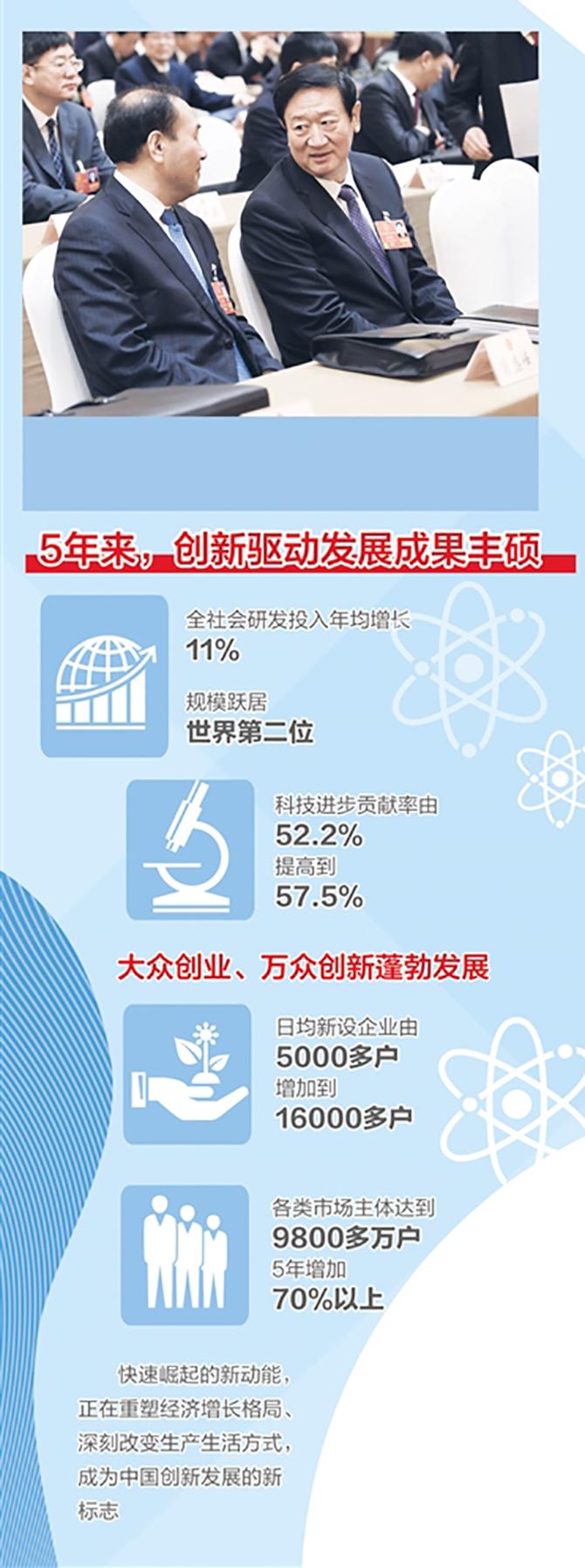 這5年,創新驅動發展成果豐碩。全社會研發投入年均增長11%,規模躍居世界第二位;科技進步貢獻率提高了5.3個百分點;載人航天、深海探測、量子通信、大飛機等重大創新成果不斷涌現;高鐵網絡、電子商務、移動支付、共享經濟等引領世界潮流……這一切,都源于我們實施的創新驅動發展戰略。在今年兩會上,代表委員圍繞“創新”這個關鍵詞,有講不完的話題。