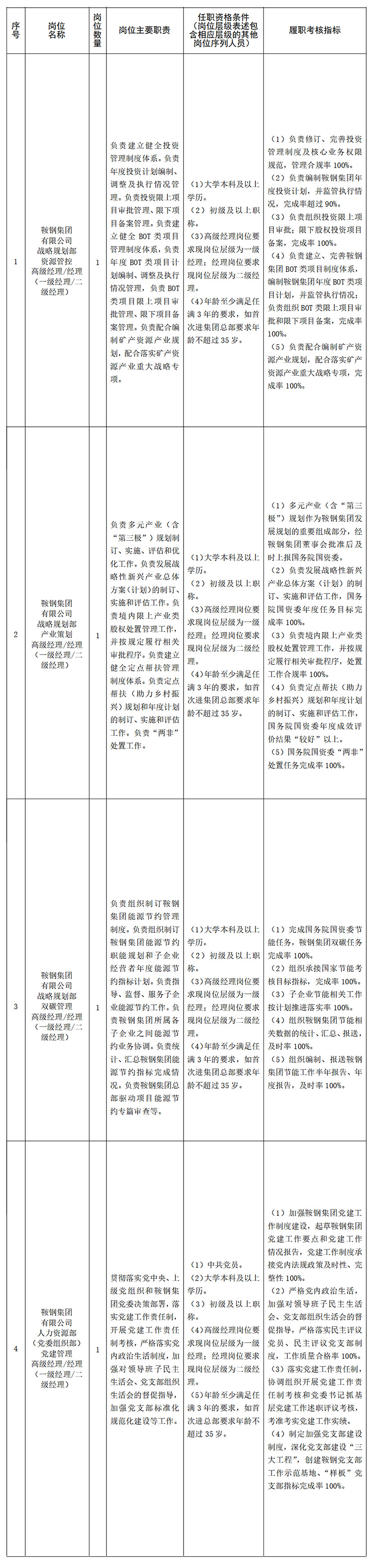 按照鞍鋼集團三項制度改革相關(guān)要求,為進一步擴大選人用人視野,鞍鋼集團黨委組織部決定在全集團范圍內(nèi)公開選拔4名集團總部專業(yè)職能崗位人員,歡迎符合條件的人員和廣大職工積極參與和監(jiān)督。具體要求如下: