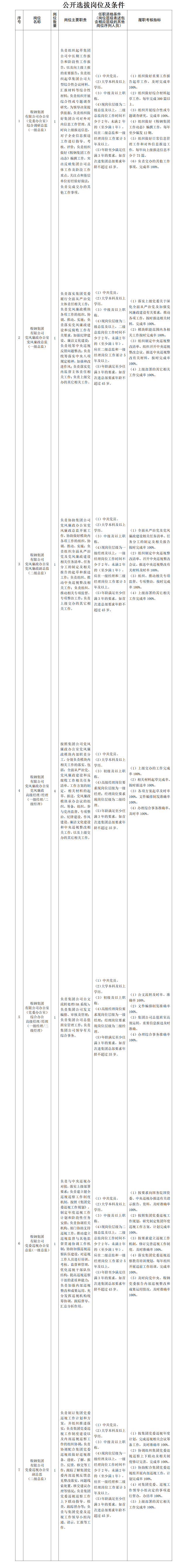 按照鞍鋼集團三項制度改革相關要求,為進一步擴大選人用人視野,鞍鋼集團黨委組織部決定在全集團范圍內公開選拔10名集團總部專業職能崗位人員,歡迎符合條件的人員和廣大職工積極參與和監督。具體要求如下: